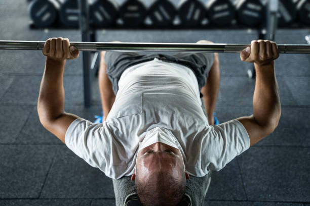 5. 숨을 들이마시고 바벨을 천천히 가슴 바로 위까지 내린 후 다시 들어 올리며 가장 힘든 구간을 지날 때 잠시 숨을 참았다가 끝까지 들어 올리면 숨을 내쉰다.