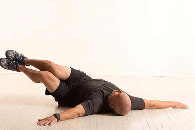 3. 양 팔이 바닥에서 떨어지지 않게 유의하면서 양다리를 왼쪽 오른쪽으로 번갈아가며 내렸다가 올렸다가를 반복한다.